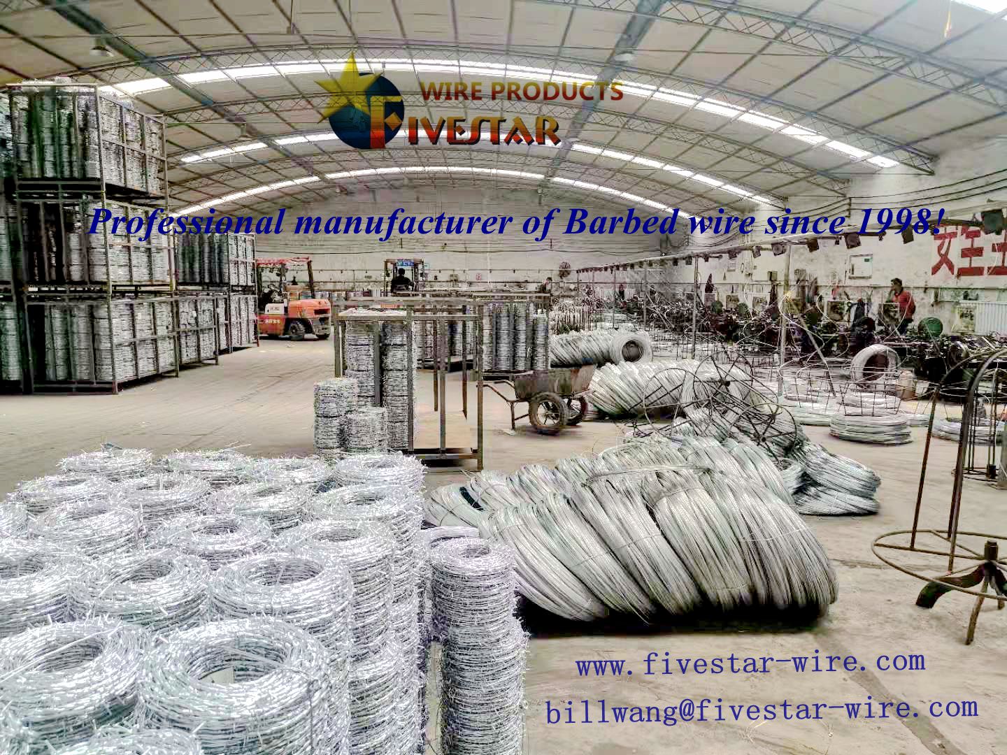 Hebei Five-Star Metal Barbed wire Factory produces 1500 tons per month and employs 80 people. The barbed rope is twisted and woven by a fully automated barbed rope machine. Commonly known as iron thistle, prickly wire, or prickly thread in folk customs. Product types: single wire twisted knitting and double wire twisted knitting. Raw materials: High quality low-carbon steel wire or high carbon steel wire. The tensile strength is divided into 250kgf and 350kgf, with sufficient impact resistance; Surface treatment process: electrogalvanizing(zinc coated 10g-20g/square meter), hot-dip galvanizing( zinc coated 40-180g/square meter), plastic coating, spray coating. There are colors such as blue, green, and yellow. Having excellent corrosion resistance, it also extends the service life of the barbed rope; According to customer needs, we can produce double stranded and single stranded barbed ropes. Specific models BWG16 x BWG16, BWG14 x BWG14 BWG15 x BWG15 or produced according to customer requirements, while accepting OEM. Barb distance from 7.5cm to 150cm,Barb length 1.5cm to 3.0cm.50 meters, 100 meters, 200 meters, 250 meters, 500 meters per roll, with metal handles, wooden shafts, plastic shafts, and other packaging. Usage: Used for isolation and protection of grassland boundaries, railways, highways, etc. The products are exported to markets in the Americas, Europe, Australia, Africa, Southeast Asia, and the Middle East.