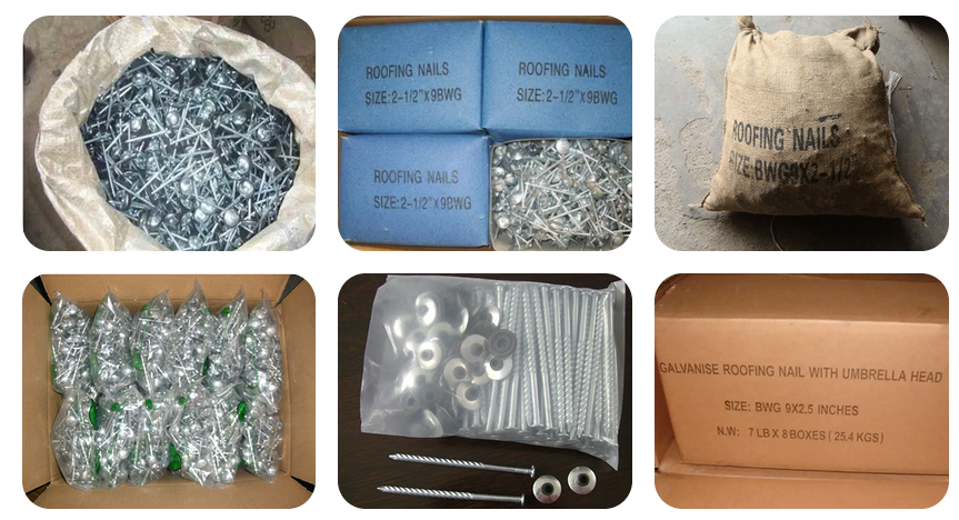 Umbrella head roofing Nails are also called roofing nails. The material is used by high-quality Q195 and Q235 steel wire. The Finish can be galvanized, black, yellow, white, and the shank of the roofing nails can be spiral shank, plain shank, groove shank, straight shank, twisted shank.